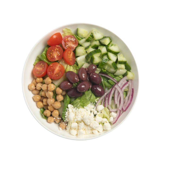 romaine, chickpeas, cherry tomatoes, cucumber, onion, olives, feta