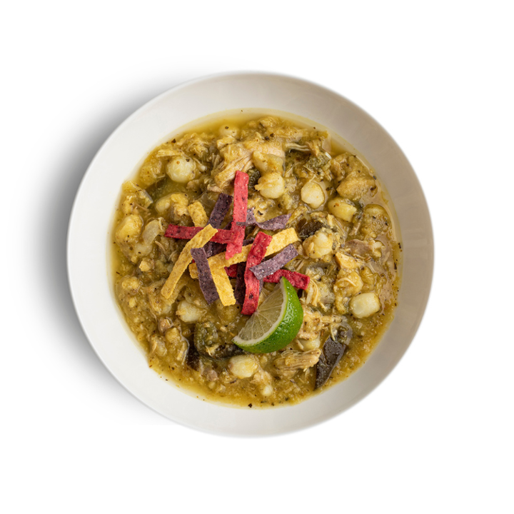 Chicken, onion, garlic, cilantro, celery, carrots, poblano pepper, tomatillo, corn tortilla, oregano, cumin, hominy, lime.