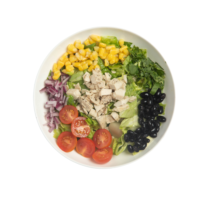 romaine, onion, chicken, black beans, corn, cherry tomatoes, cilantro