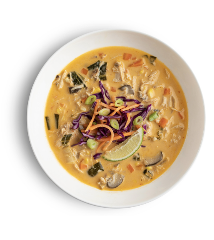 Chicken, garlic, ginger, kaffir lime leaves, Onion, lemongrass, coconut milk, lime, red curry paste, salt, pepper, fish sauce, bok choy, shiitake mushrooms, carrots, corn, and cilantro RED CURRY CONTAINS SHELLFISH