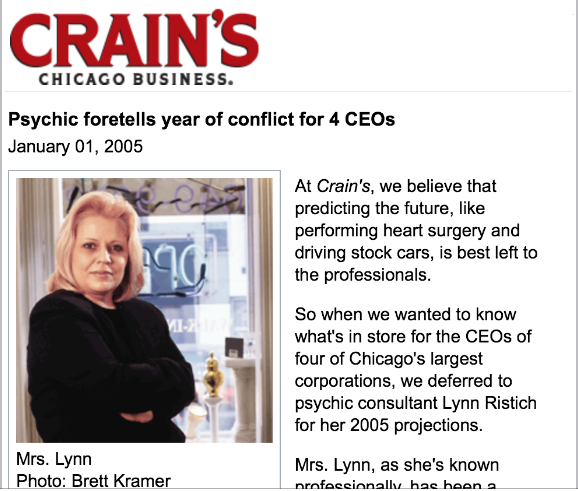Mrs. Lynn is a third generation Psychic Reader, Clairvoyant, and Energy Worker. For more than 30 years, she has been helping people from around the world with her psychic guidance. Nationally recognized for her work, she has appeared on Good Morning America and the TODAY show. She's been featured nationally on Radio and in Magazines, and locally on CBS chicago and Chicago talk Radio as well as Chicago Crain's Magazine. Her Life's work as a psychic reader even the subject of a museum exhibit, Sponsored by "Chicago Talk Radio". Celebrities, High POwered CEOs and Everyday People, seek her help and advice. She has a genuine concern and compasion for the others and this is evident in her thoughtful and caring guidance. Due to her natural ability and her studies of psychic energy, she is often invited to speak on the topic of psychic energy and its practical application in the modern world. Even though she enjoys the success of her public speaking and writing, it is her consultations with those seeking her psychic advice, which remains the mainstay of her work. She believes that it's her spiritual responsibility to stay available to people who need her. Although she does not impose her personal spiritual beliefs on others, Mrs. Lyn has a strong personal faith in God and acknowledges her ability as a gift fron God- Our Creator. Mrs. Lynn understands the importance of philanthropy, regularly donating her time to help young psychics learn how to cultivate thein natural abilities and donating her services at charitable events. A session with Mrs. Lynn can reveal valuable information with astonishing accuracy. If you've searched and prayed for answers only to be repeatedly dissapointed, then you are reading this by divine appointment. Mrs. Lynn excels where other psychics and spirituals fail. Mrs. lynn regularly receives referrals of the most diffcult cases from spiritualist and other psychics. She is proud to have earned the respect of her professional peers. In her work, she is committed to helping the people who turn to her. She blends psychic insight with advice for practical applications so you not only learn what is going on but also get clear direction to the best possible outcome. All consultations are charged at a flat rate so even if your reading should last over an hour, there is no extra charge. Mrs. Lynn is a native Chiacagoan. She grew up in Chiacgo, and through her work has touched the lives of people worldwilde, Chicago has always remained her hometown. You can visit her at her office in Chicago (a few blocks from the (Miracle Mile) at 200w. Ohio St. - where she's been located since 1994, or at her meditation center in Elmhurst, IL. She offers a variety of readings and services, including psychic readings, tarot card readings, soulmate readings, energy clearing, and soulmate uniting. Mrs. Lynn also offers a complimentary relationship analysis. Feel free to ask more about available readings and service.
