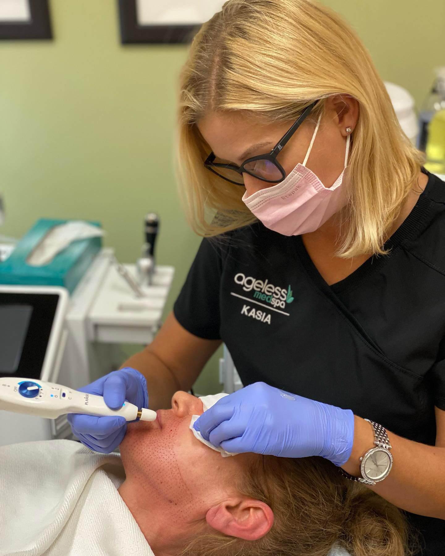 RF microneedling stimulates collagen and elastin to help rebuild damaged skin. Ageless MedSpa can treat fine lines and wrinkles, stretch marks and loose skin, jowls and sagging neck, acne, injury, or surgical scars, and enlarged pores and rough textures.