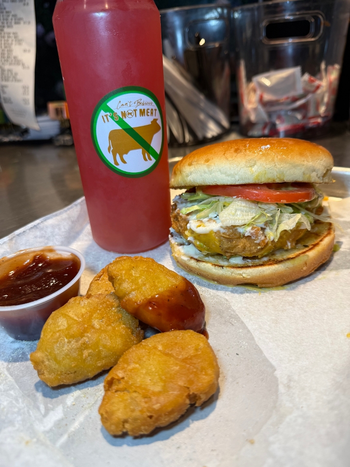 Savory vegan burger patty, drizzled in our sweet chilli sauce, vegan American cheese, jalapeños, vegan bacon and vegan Shrimp. On a vegan Bun!