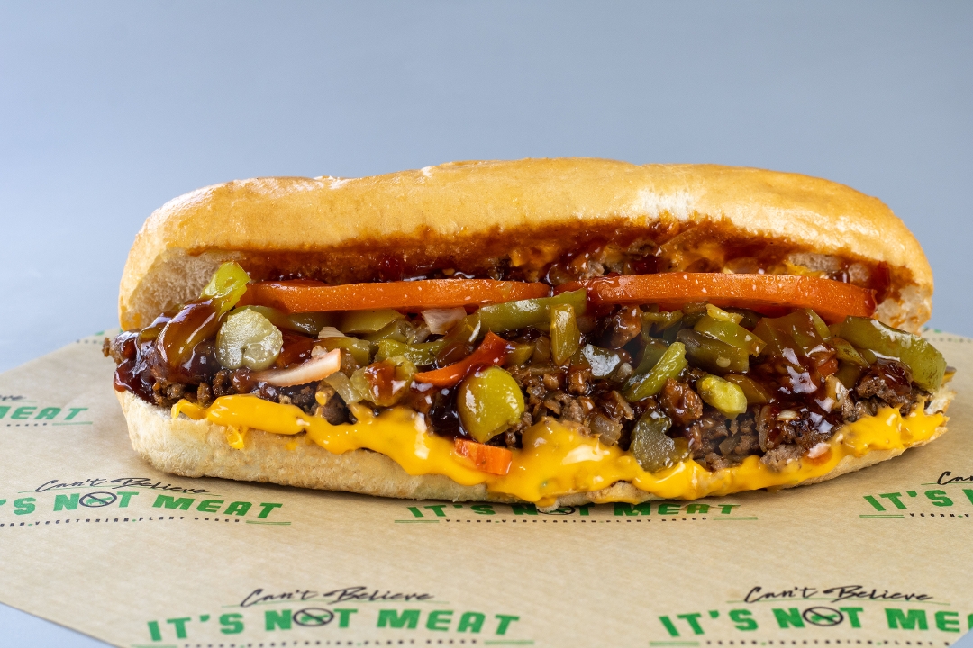 Vegan chopped steak marinated in green bell peppers, onions, mushrooms, and green peppers. Topped with vegan nacho cheese tomatoes, Mayo and green leaf lettuce on a vegan bun!