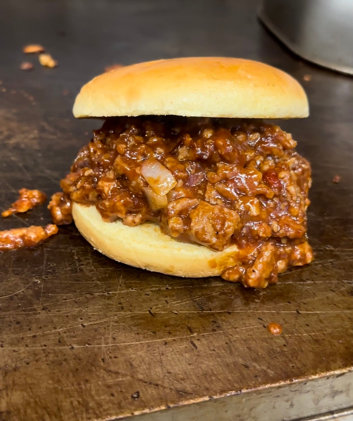 Sloppy Joe A traditional vegan sloppy Joe with with vegan ground beef drenched in a sweet house made tomato based savory sauce on a vegan brioche bun.