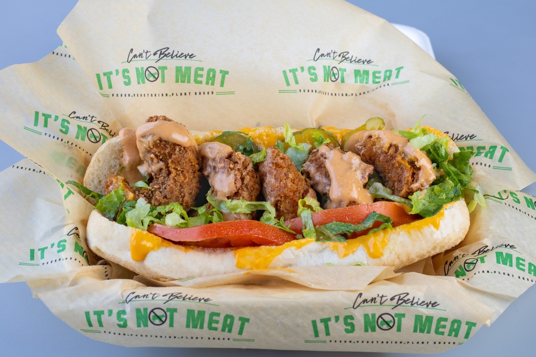 Our vegan fried shrimp with our house made epitome sauce , topped with tomatoes ,lettuce ,and pickles . Served with bed of fries