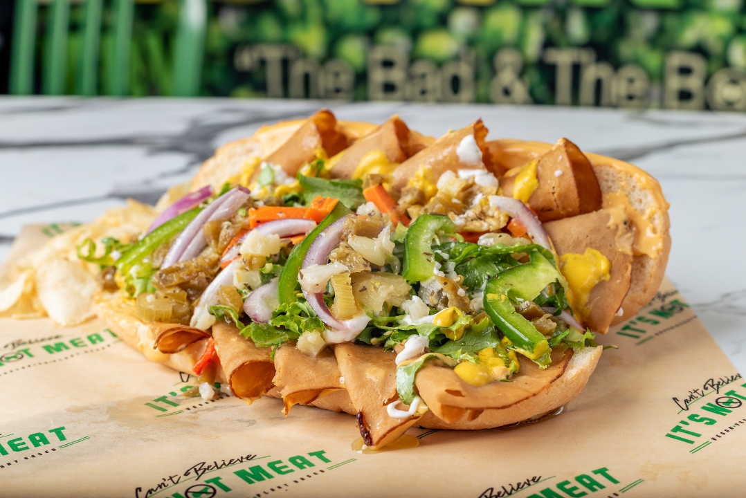 Made with our vegan steak & topped w/ lettuce, tomato, green peppers, onions, mushrooms, jalapenos, vegan mayo, cheese W/fries. Chik'n or Mix it (Chik'n × Steak) option available