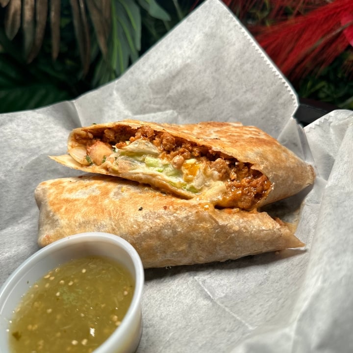 Burrito on a flour shell, stuffed with our vegan ground beef, mozzarella cheese, pico de gallo, vegan sour cream, lettuce, and side salsa verde.