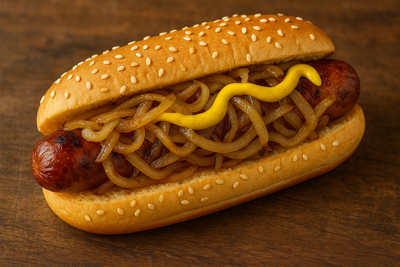 Chicago-style pan-fired Polish sausage sandwich, topped with grilled onions and yellow mustard, served on a sesame-seed bun.