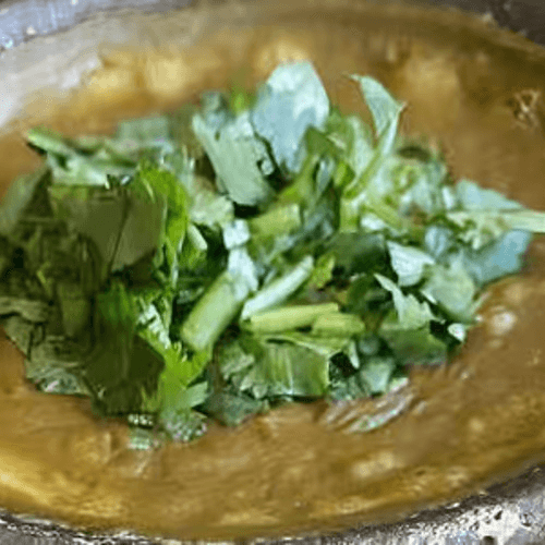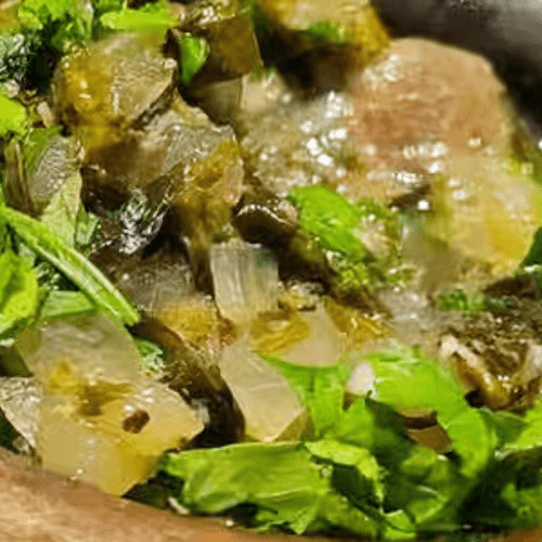 Lamb stew made with onions, tarragon, Tkemali, fresh garlic and herbs