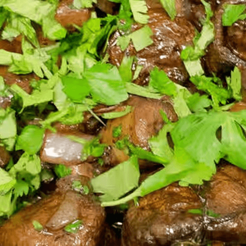 Vegan. Mushrooms stew made with onions, tarragon, Tkemali, fresh garlic and herbs