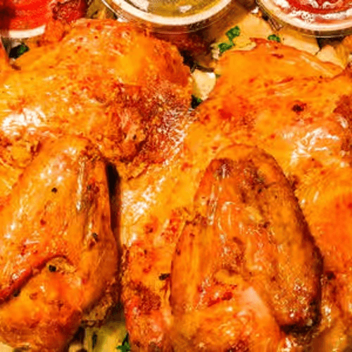 A pan-fried crispy whole chicken served with a trio mix of Georgian sauces on the bed of Georgian country-style potatoes