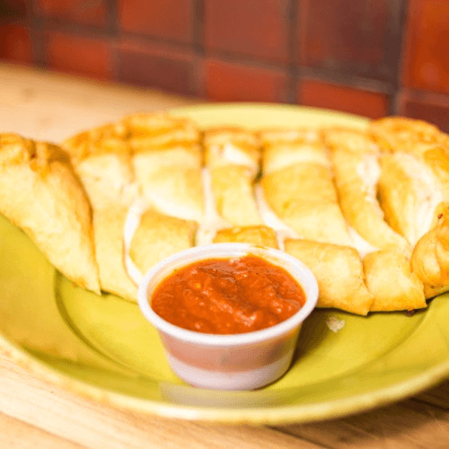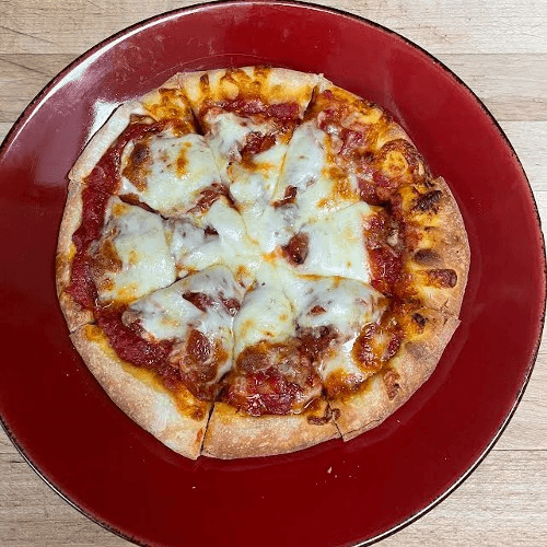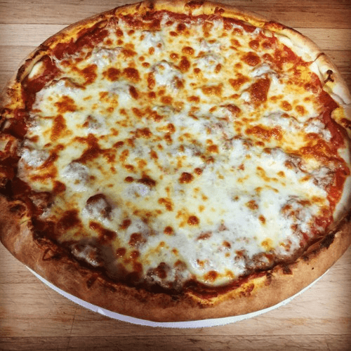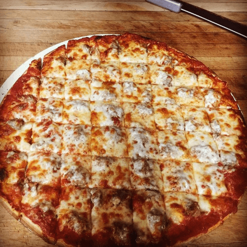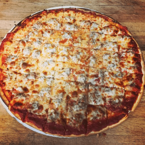 Regular-crust pizza with our homemade sausage, mushrooms, green peppers & onions