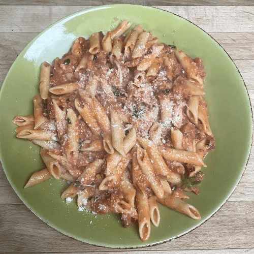 Mostaccioli tossed in a spicy tomato-basil sauce with onions, bacon & cream