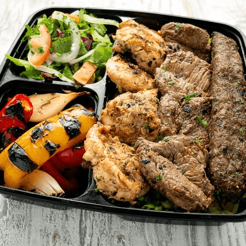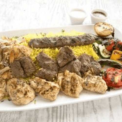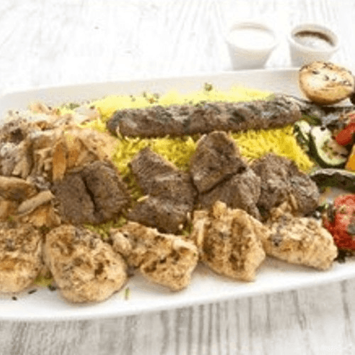 For 1 and 2 People: our popular combination of beef and chicken kababs, a kifta skewer and chicken shawarma. For 5 and 10 People: Beef kabob, chicken kabob, kifta kabob, hummus, rice and salad