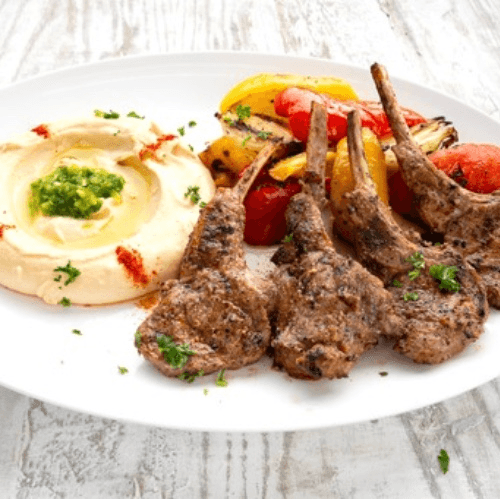 Savory lamb chops grilled to temperature served with grilled vegetables and our famous hummus. (This entree is not served with rice).