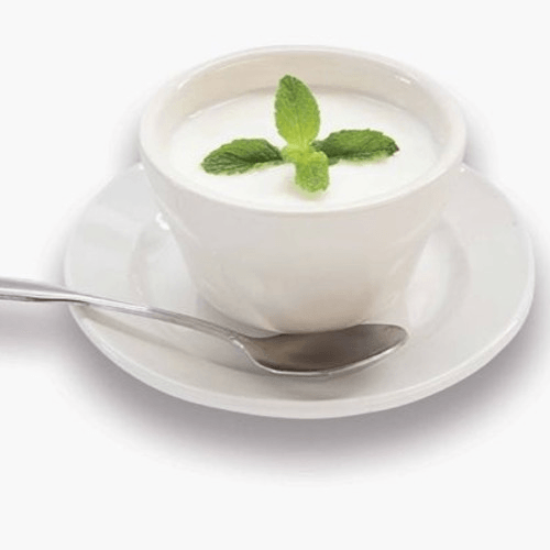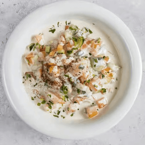 Diced cucumbers and garlic in homemade yogurt seasoned with mint.