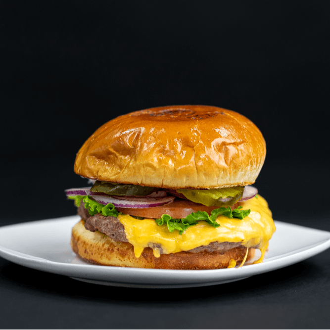 Grilled patty on a bun. Lettuce, Tomato, Red Onion, Pickles, Mustard, Ketchup, Mayo