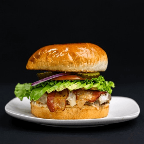 Avocado, Bacon, Swiss Cheese, Lettuce, Tomato, Red Onions, Pickles, Mustard, Ketchup, Mayo