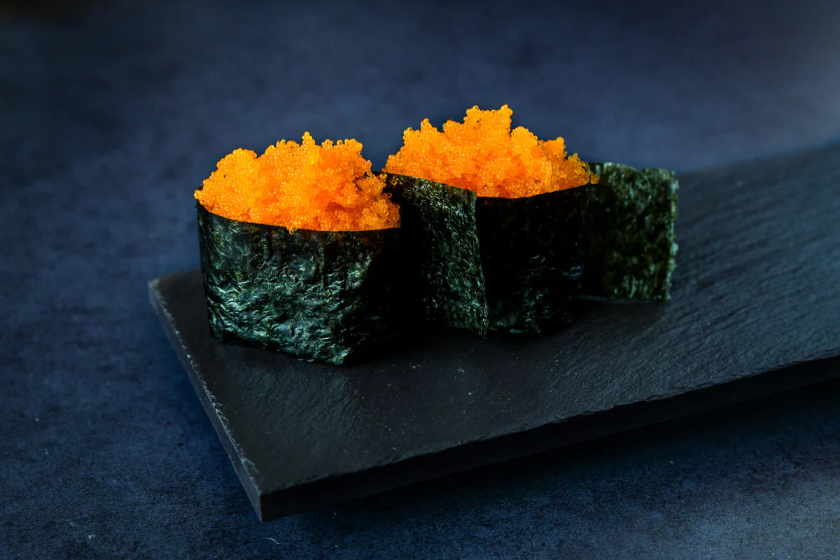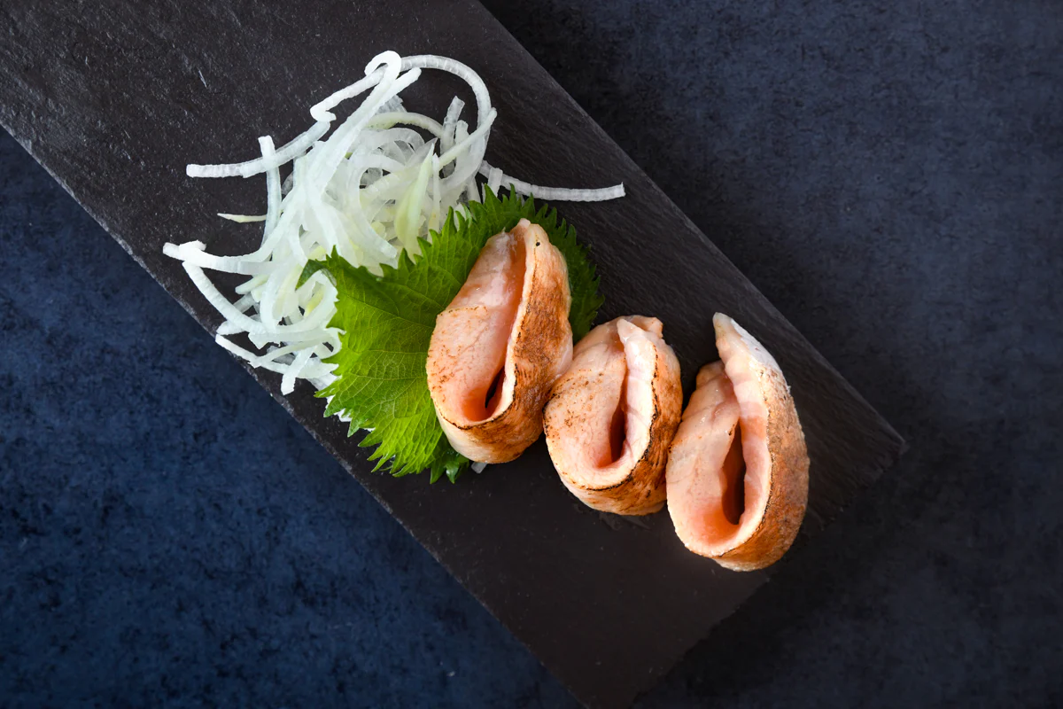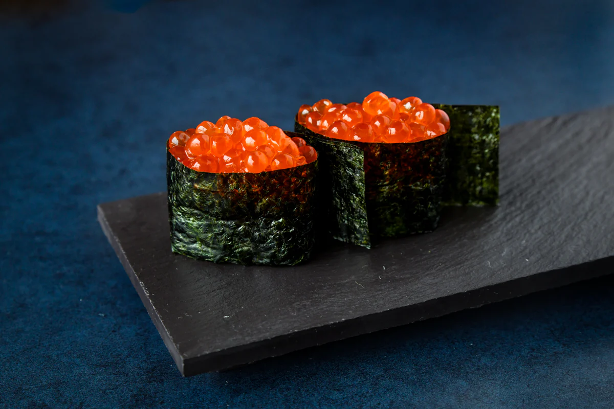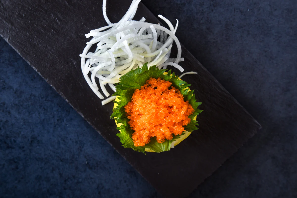 crispy salmon skin, bonito flakes, cucumber, avocado, burdock root, ikura, lemon (2 PCS)