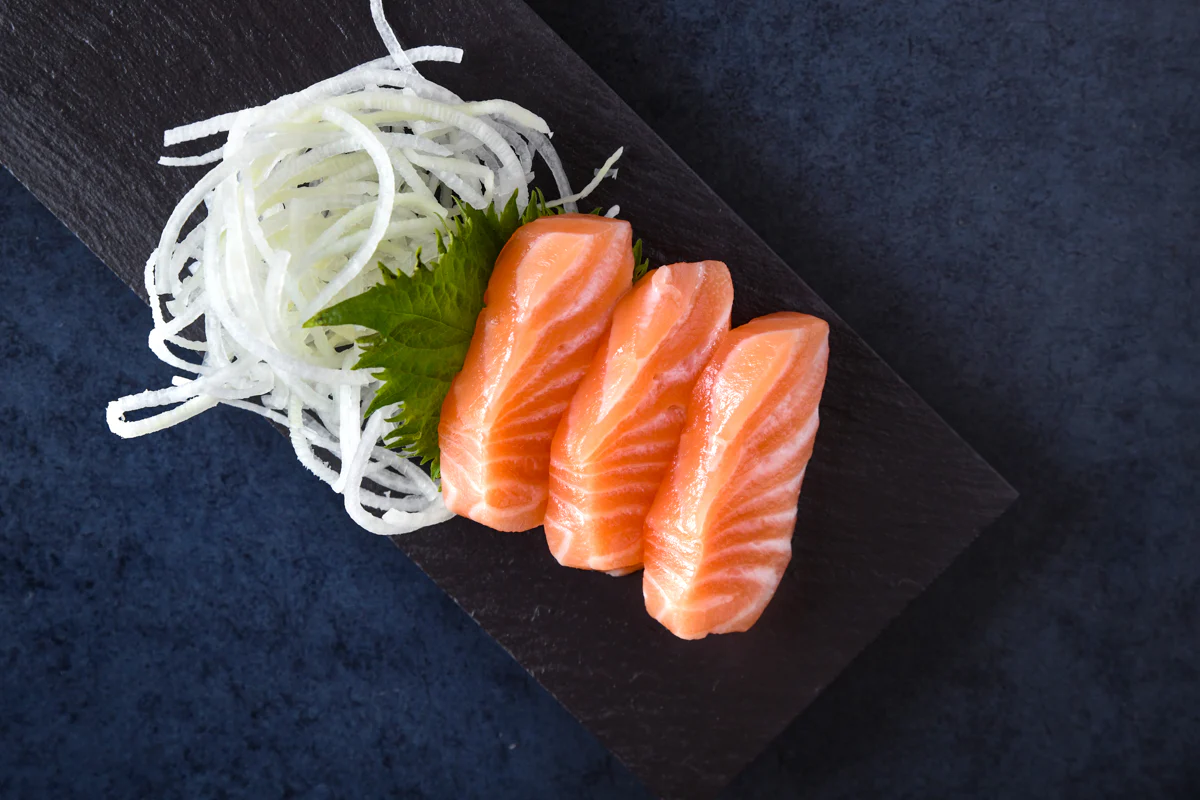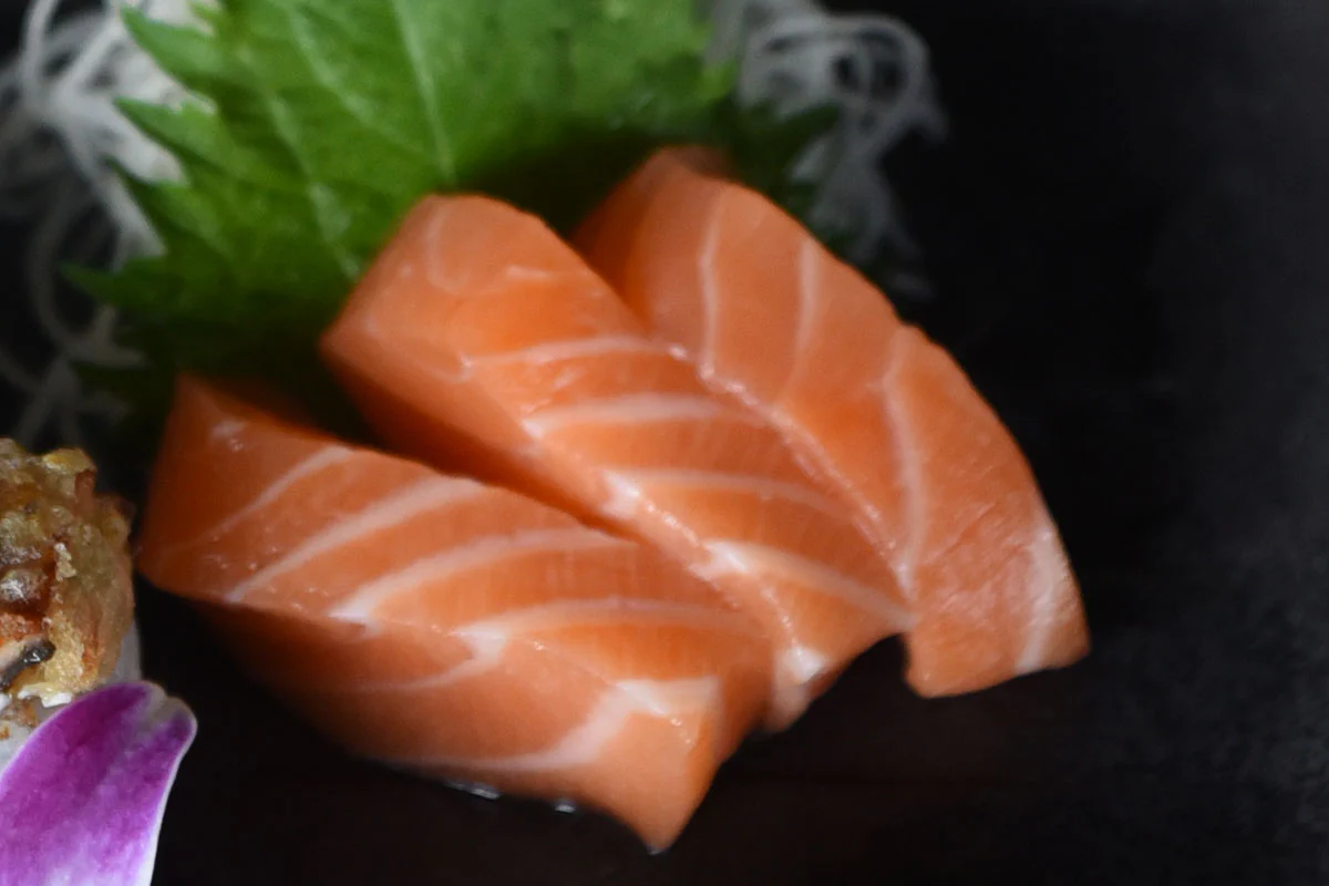 *salmon (5 pcs) with edamame, choice of starch, and fruit.