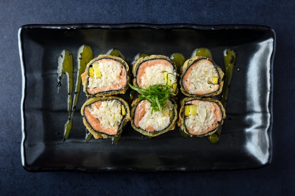 tempura fried, mango, salmon, crab mix, mango sauce (6 pcs)