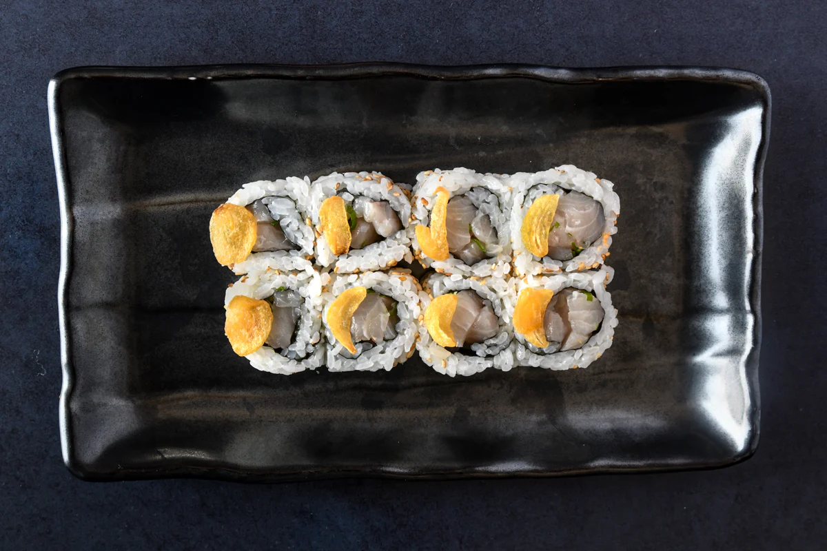 crispy salmon skin, bonito flakes, cucumber, avocado, burdock root, ikura, lemon (8 pcs)
