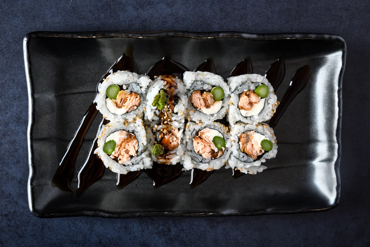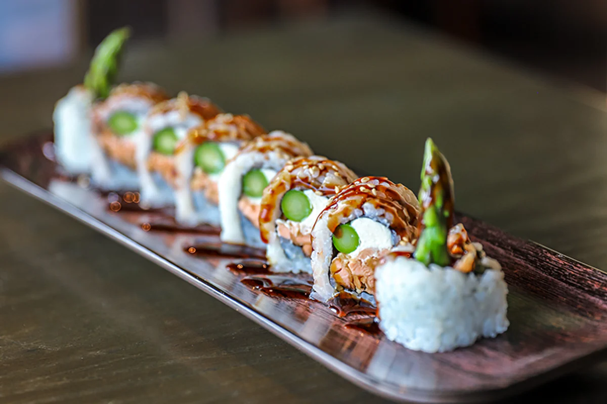 cooked salmon, cream cheese, asparagus, eel sauce (8 pcs)