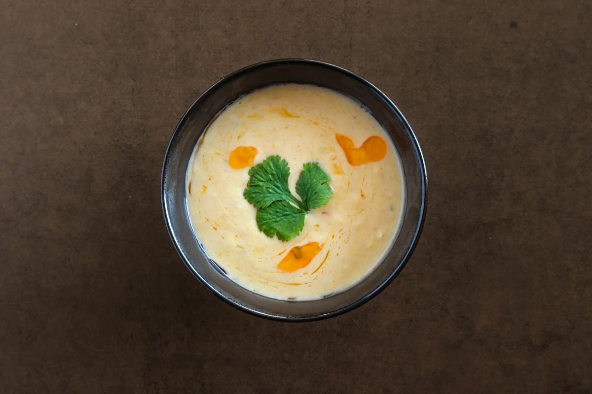roasted corn, sweet potatoes, yellow curry, coconut milk, cilantro, chili oil