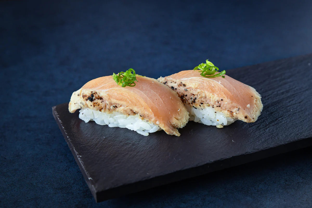 atlantic salmon, drizzled with hot sesame oil, topped with ikura, truffle ponzu sauce and wasabi sprouts (5 pcs) the seafood in this product carries an eco-certification