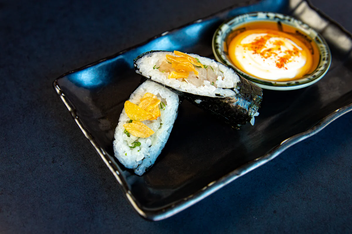 plant based tuna, cucumber, avocado, crispy quinoa, black tobiko caviart, scallion, vegan spicy aioli (8 PCS)