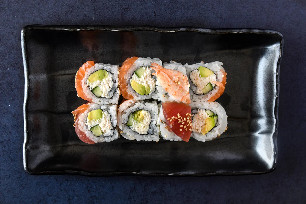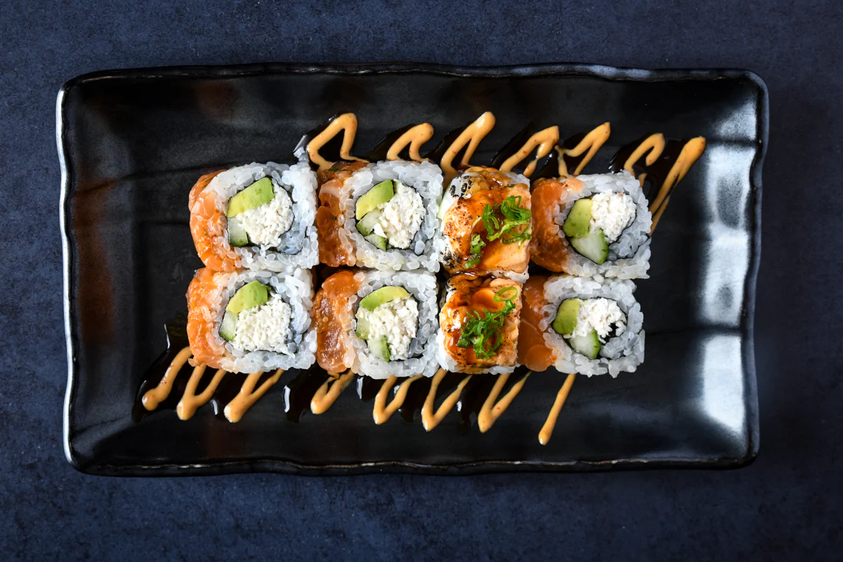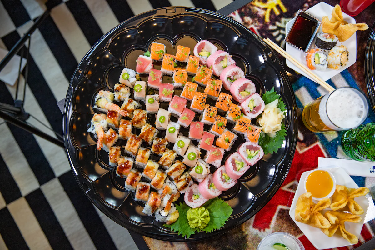 10 Rolls - the beach*(2), philadelphia*(2), tidal wave, hot popper*(2), south pacific, flamingo lingo*, spanish fly* Please allow an additional 30 minutes from the pick-up time to prepare these platters. *item contains raw seafood, shellfish, beef or egg. consuming raw or undercooked meat and seafood may increase your risk of foodborne illness. bones can happen in dishes with fishes