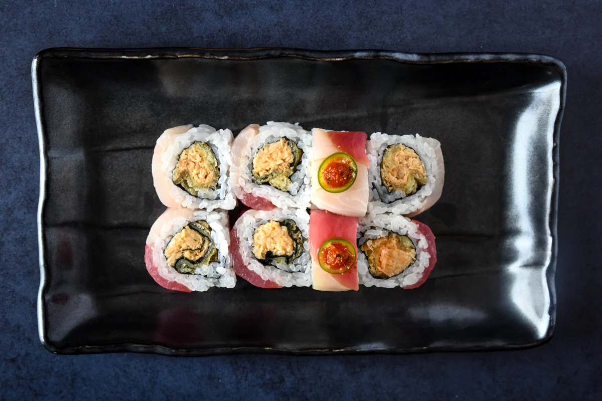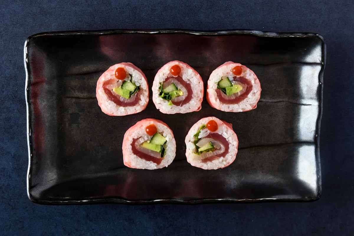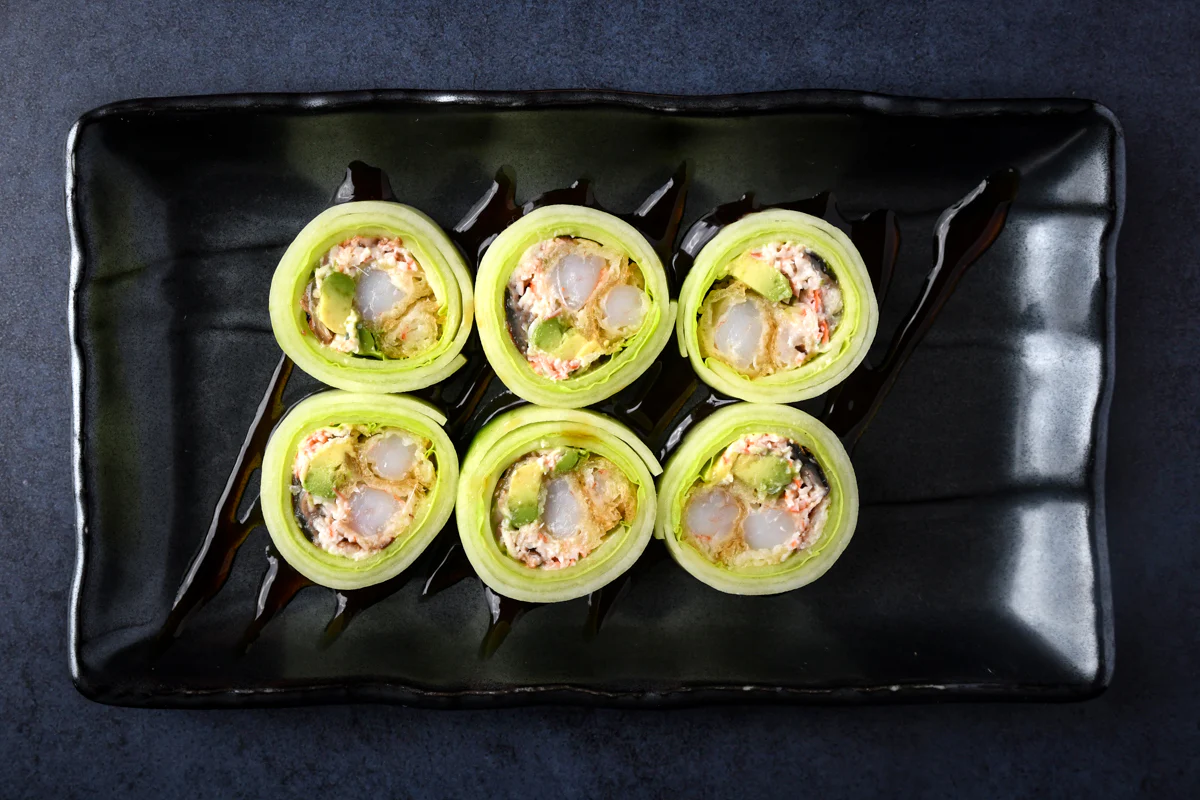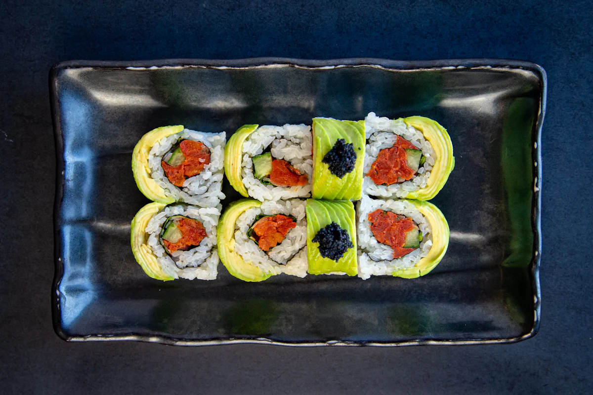 spicy plant based tuna, cucumber, cilantro, shallot, avocado, black tobiko caviar, ponzu sauce (8 pcs)