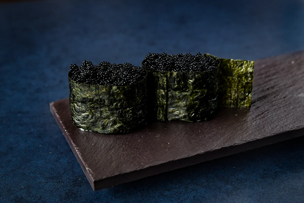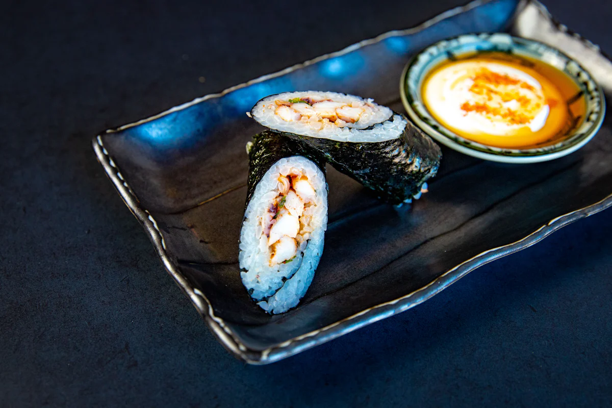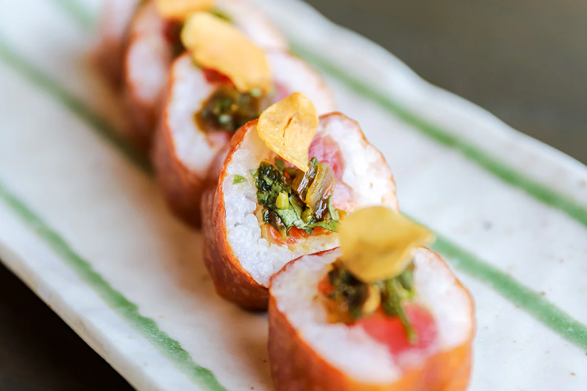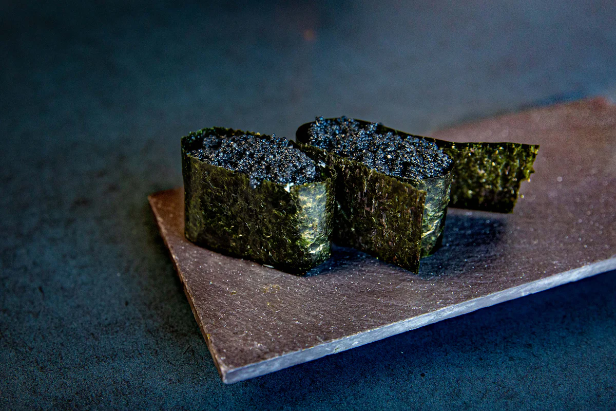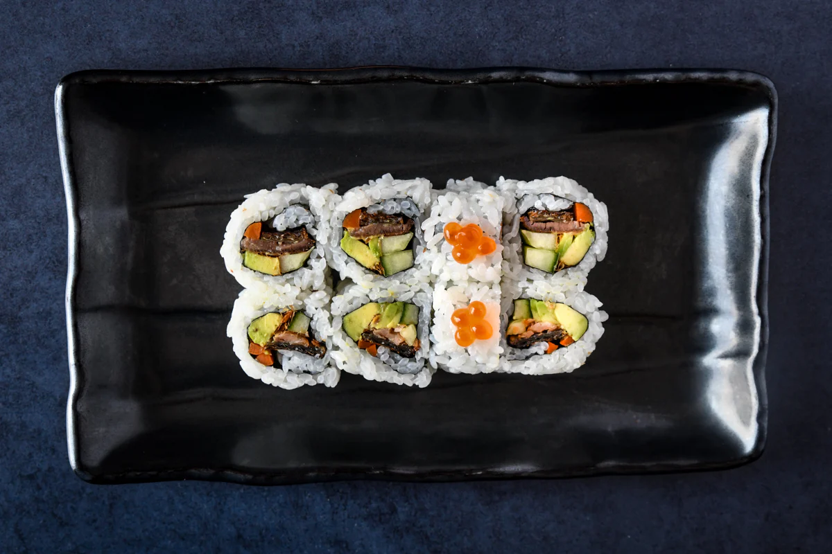 spicy plant based tuna, cucumber, cilantro, shallot, avocado, black tobiko caviar, ponzu sauce (8 pcs)