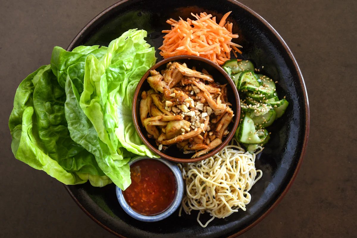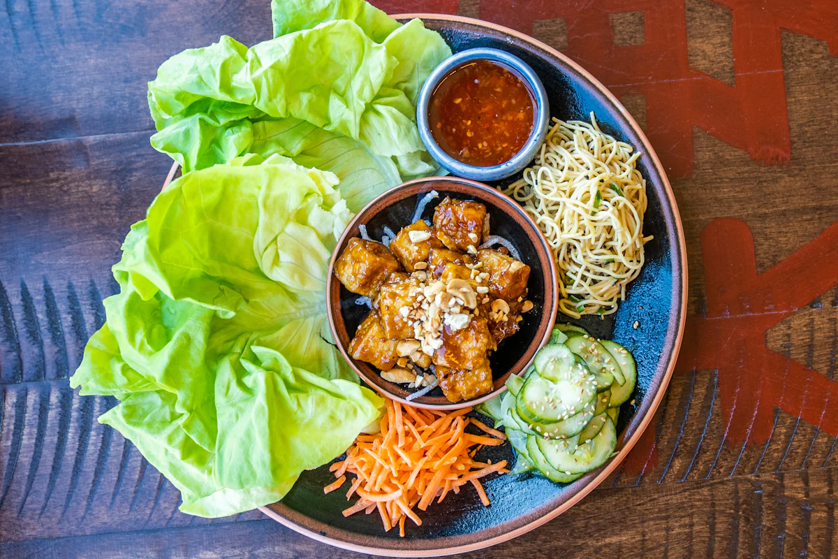 sautéed all-natural chicken breast with garlic, ginger, cashews and peanut sauce, served with butter lettuce cups, cucumber sunomono, sesame noodles, carrots, crispy rice noodles and sweet chili sauce tofu available (VG) (VG) tofu available