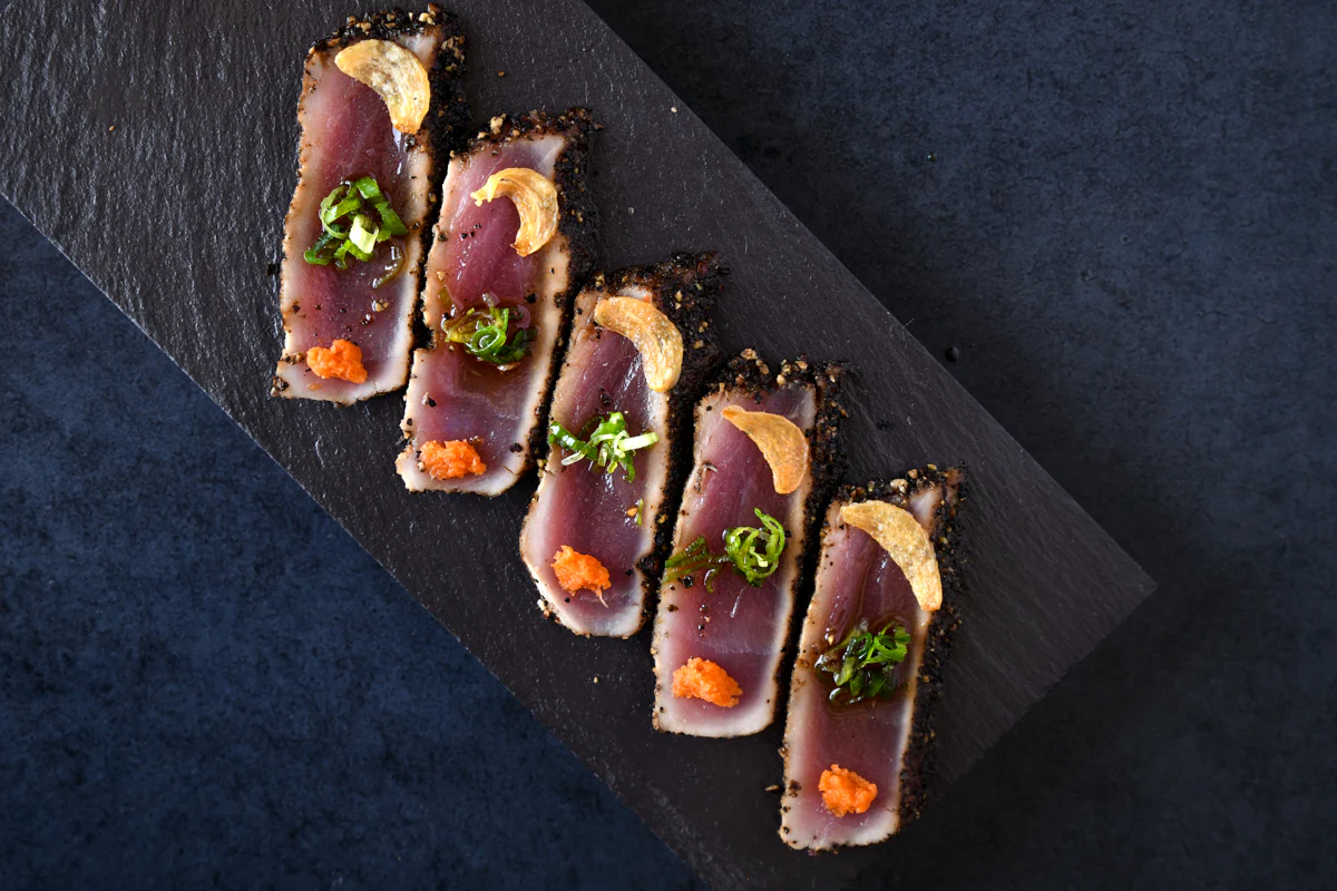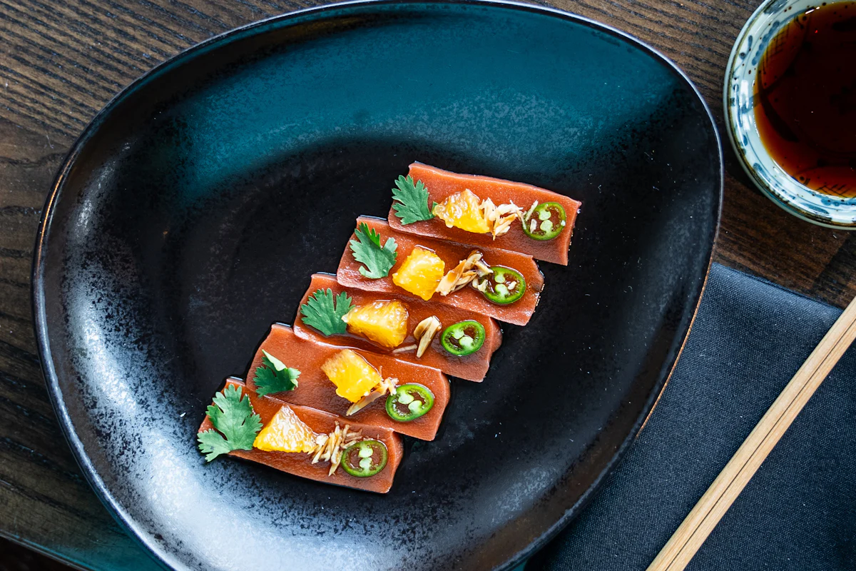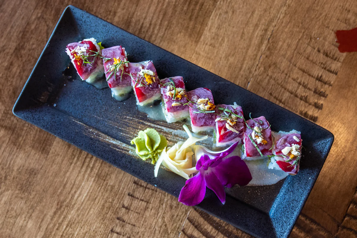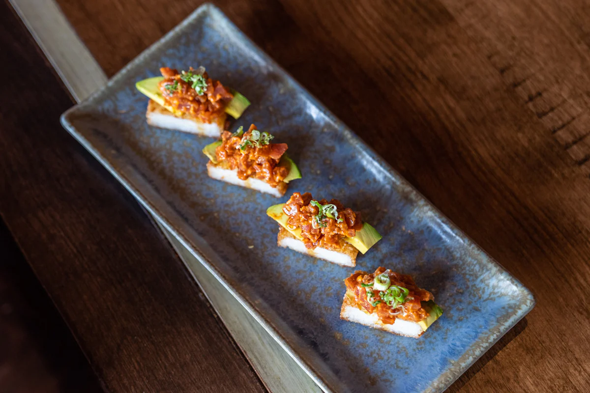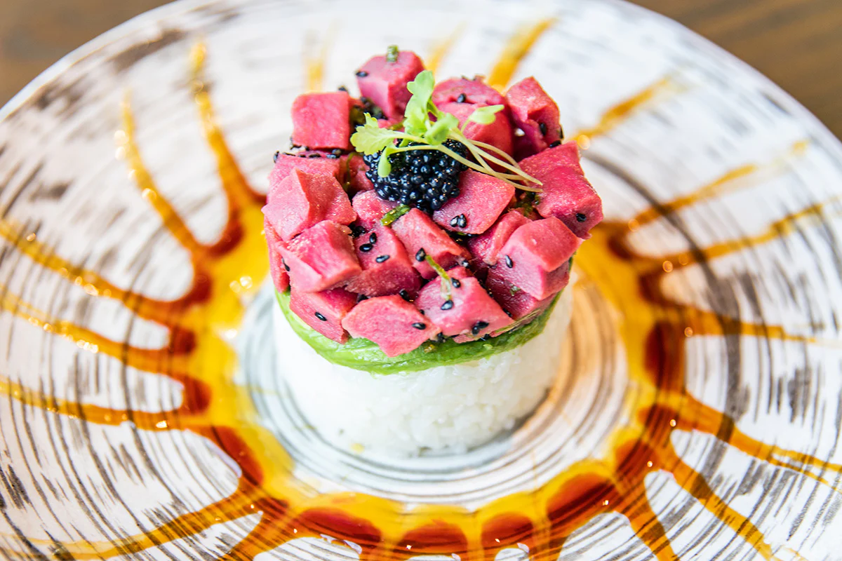 sesame and ponzu-marinated plant based tuna, avocado and sushi rice, topped with black tobiko and wasabi sprouts, served with mango and sweet soy sauce