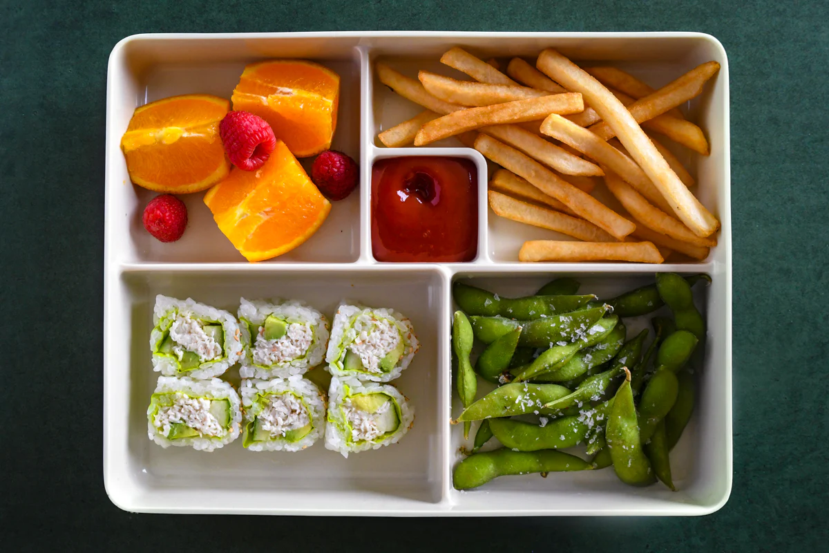 spicy crab mix, panko, eel sauce (10 pcs) with edamame, choice of starch, and fruit.