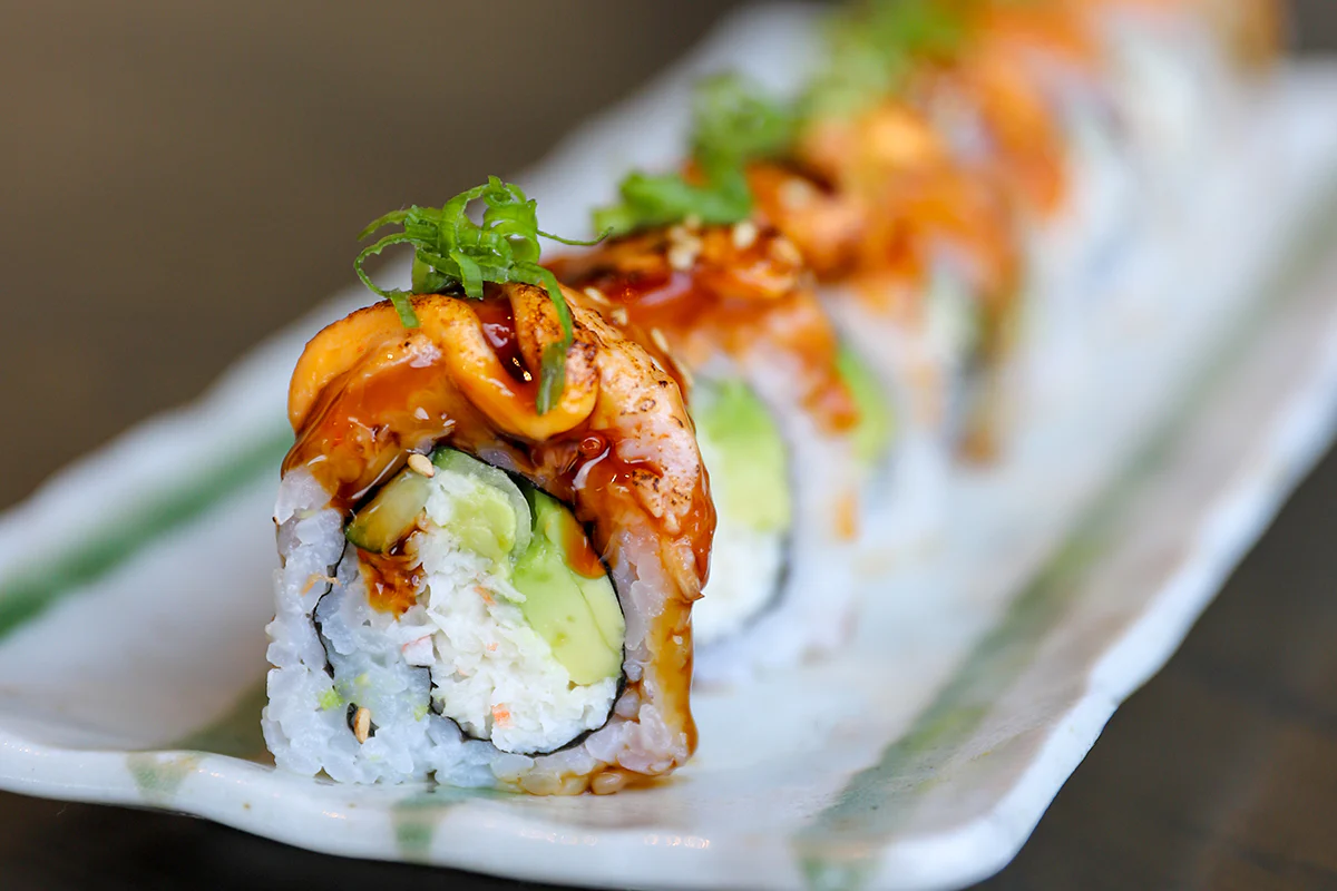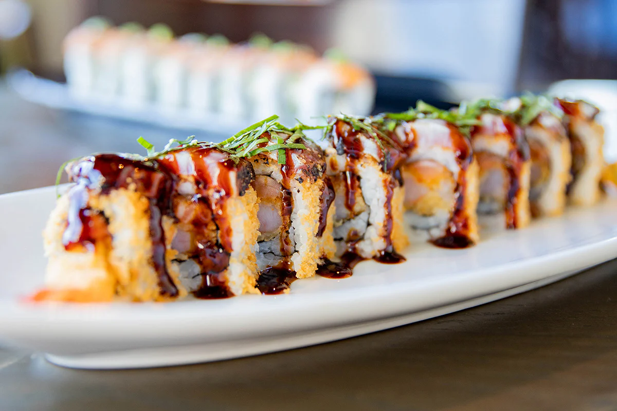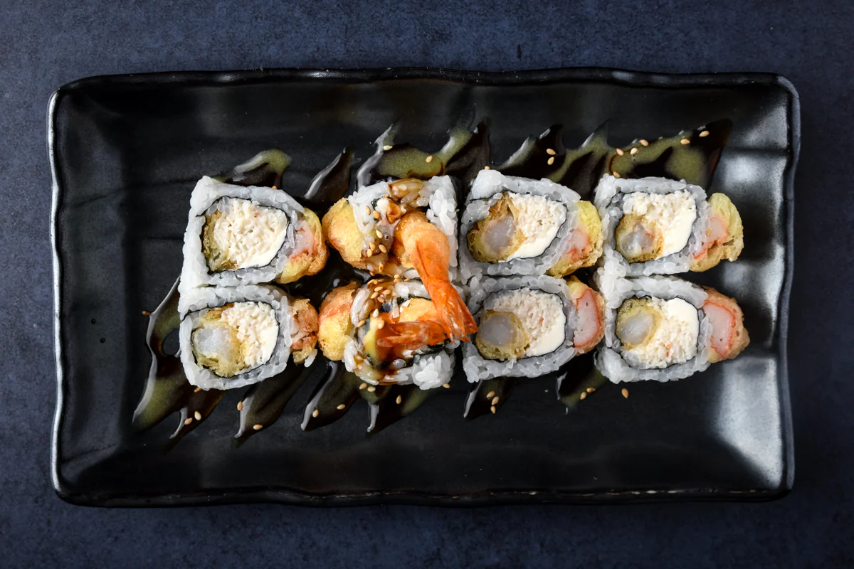 shrimp and crab stick tempura, crab mix, cream cheese, honey wasabi and eel sauces (8 pcs)