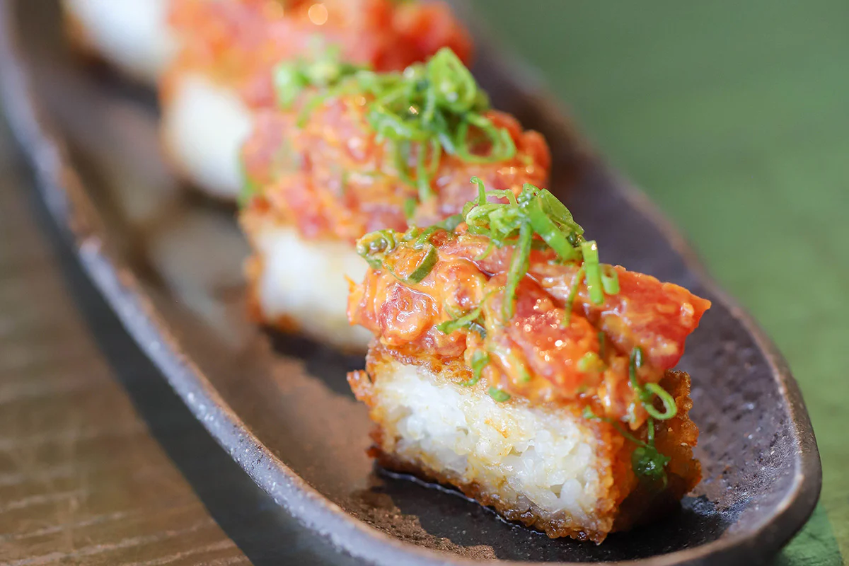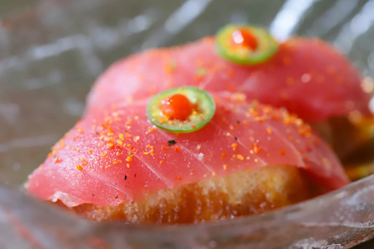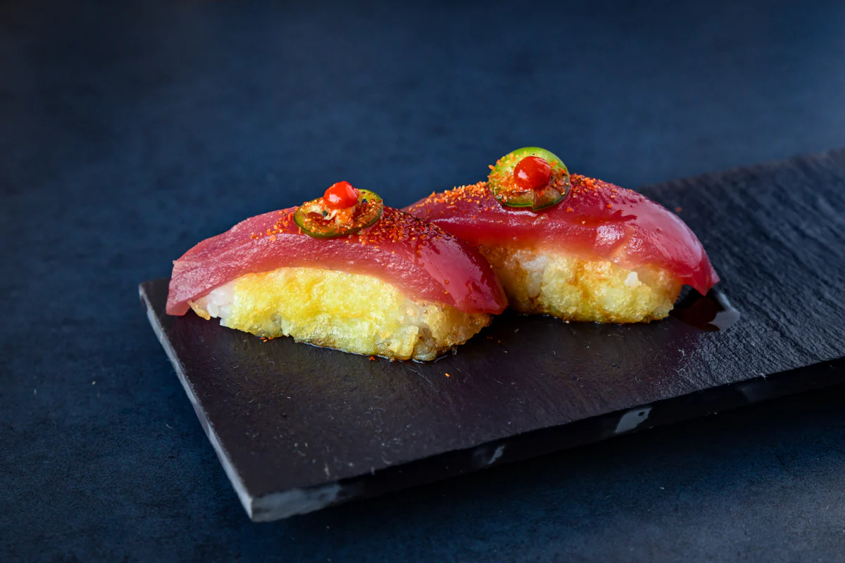 bigeye tuna on top of rice tempura, topped with serrano, sriracha, togarashi and ponzu sauce (2 pcs)