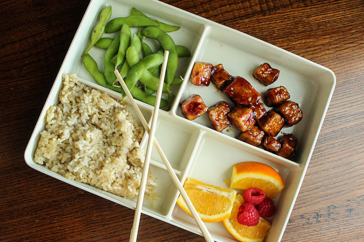 crispy sweet soy tofu with edamame, choice of starch, and fruit.