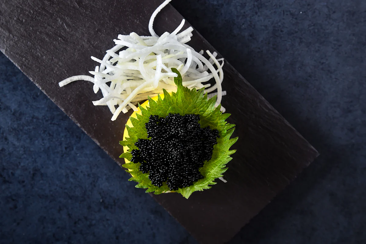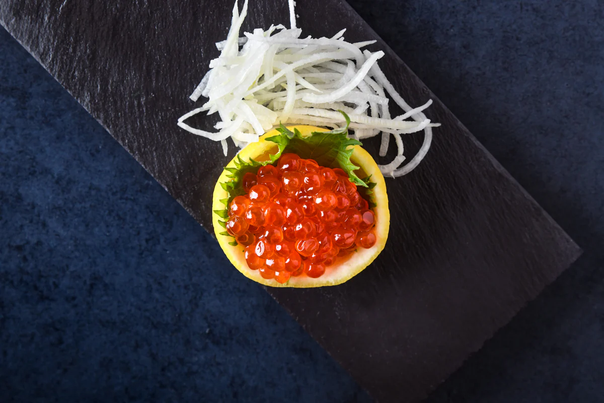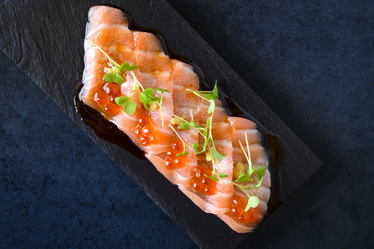 thinly sliced atlantic salmon, drizzled with hot sesame oil, topped with ikura, truffle ponzu sauce and wasabi sprouts (5 pcs) the seafood in this product carries an eco-certification