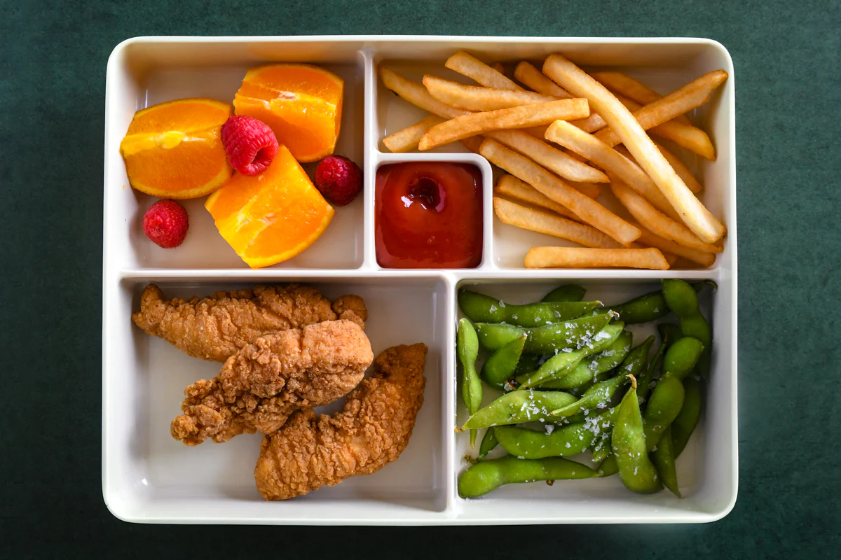 all-natural chicken tenders with edamame, choice of starch, and fruit.