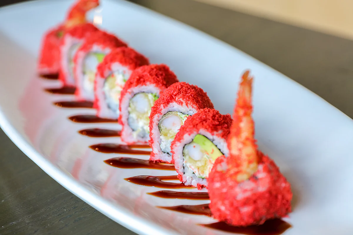 shrimp tempura, crab and tampico mix, avocado, serrano, beet tempura crisps, eel sauce (8pcs)