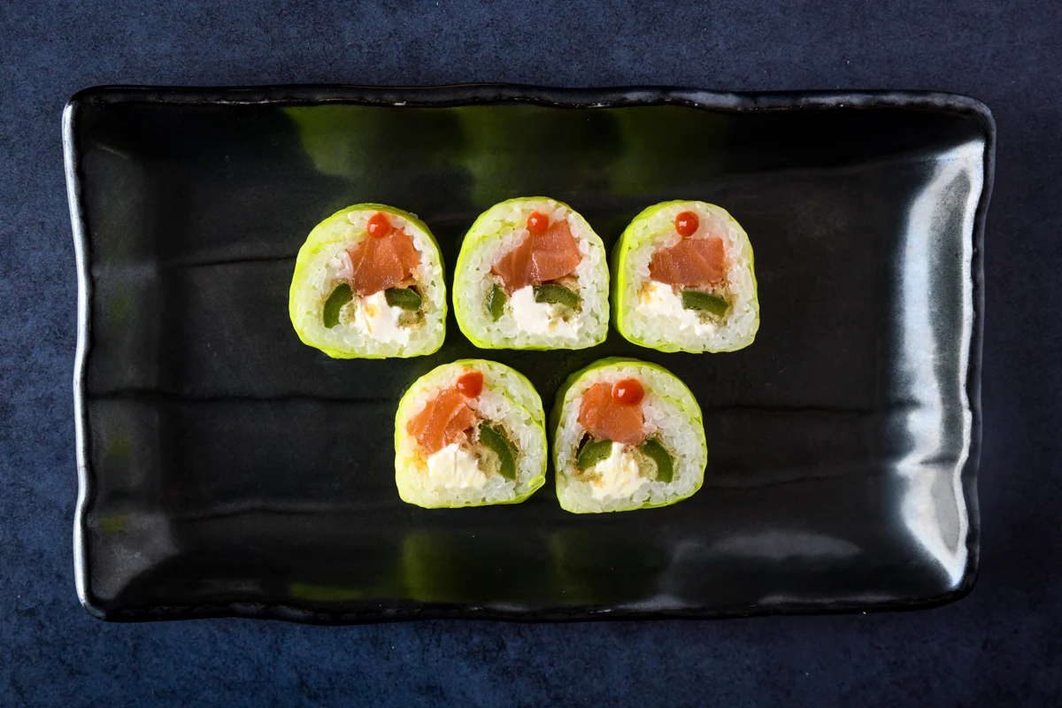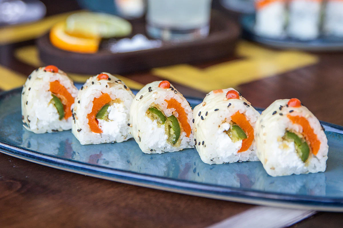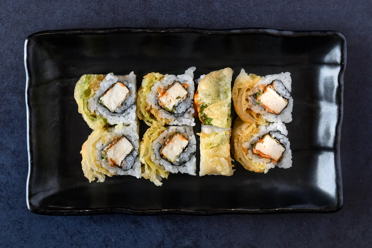 vegan smoked salmon, vegan cream cheese, vegan jalapeño tempura, soy paper, sriracha (5 PCS)