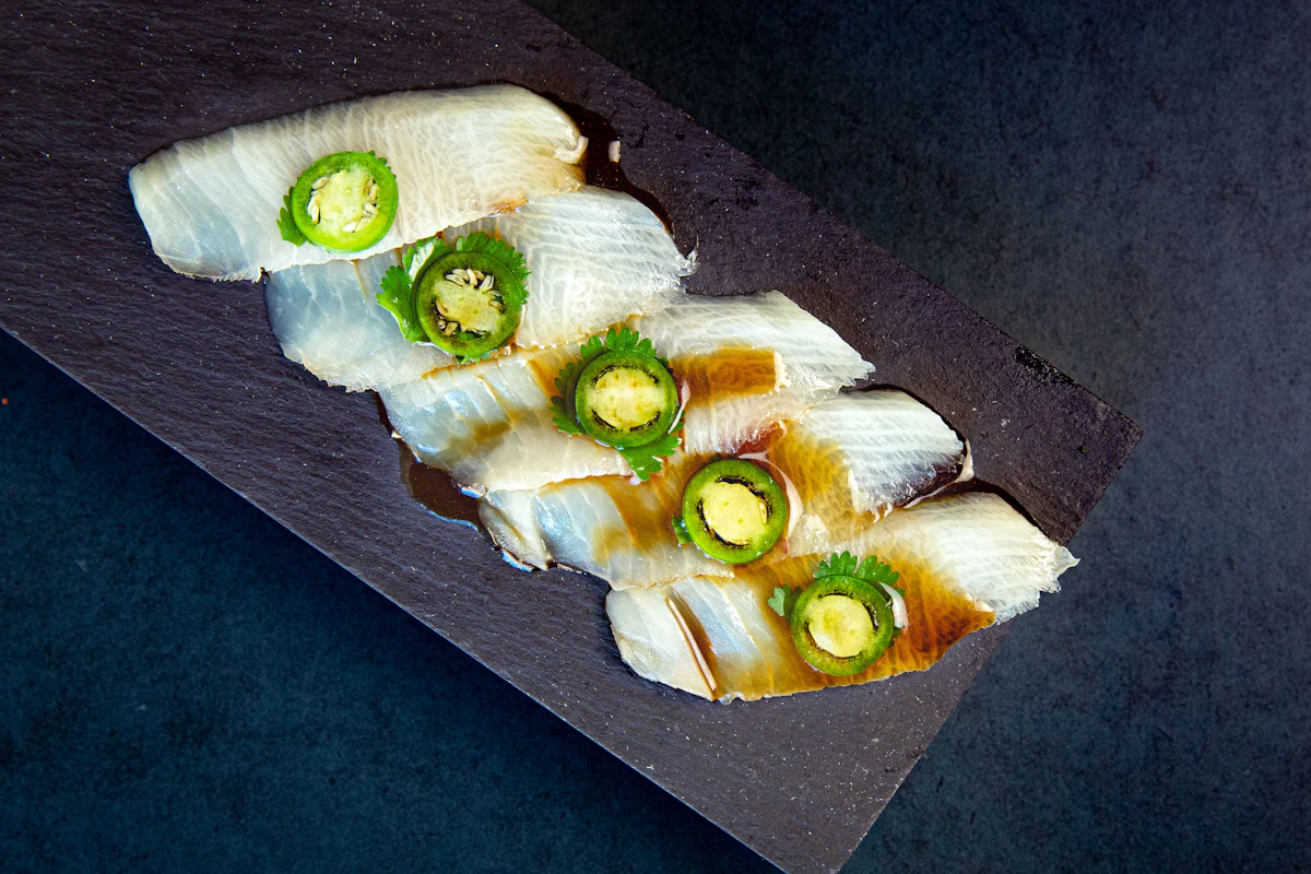 dutch yellowtail topped with cilantro, serrano and ponzu sauce (5 pcs)