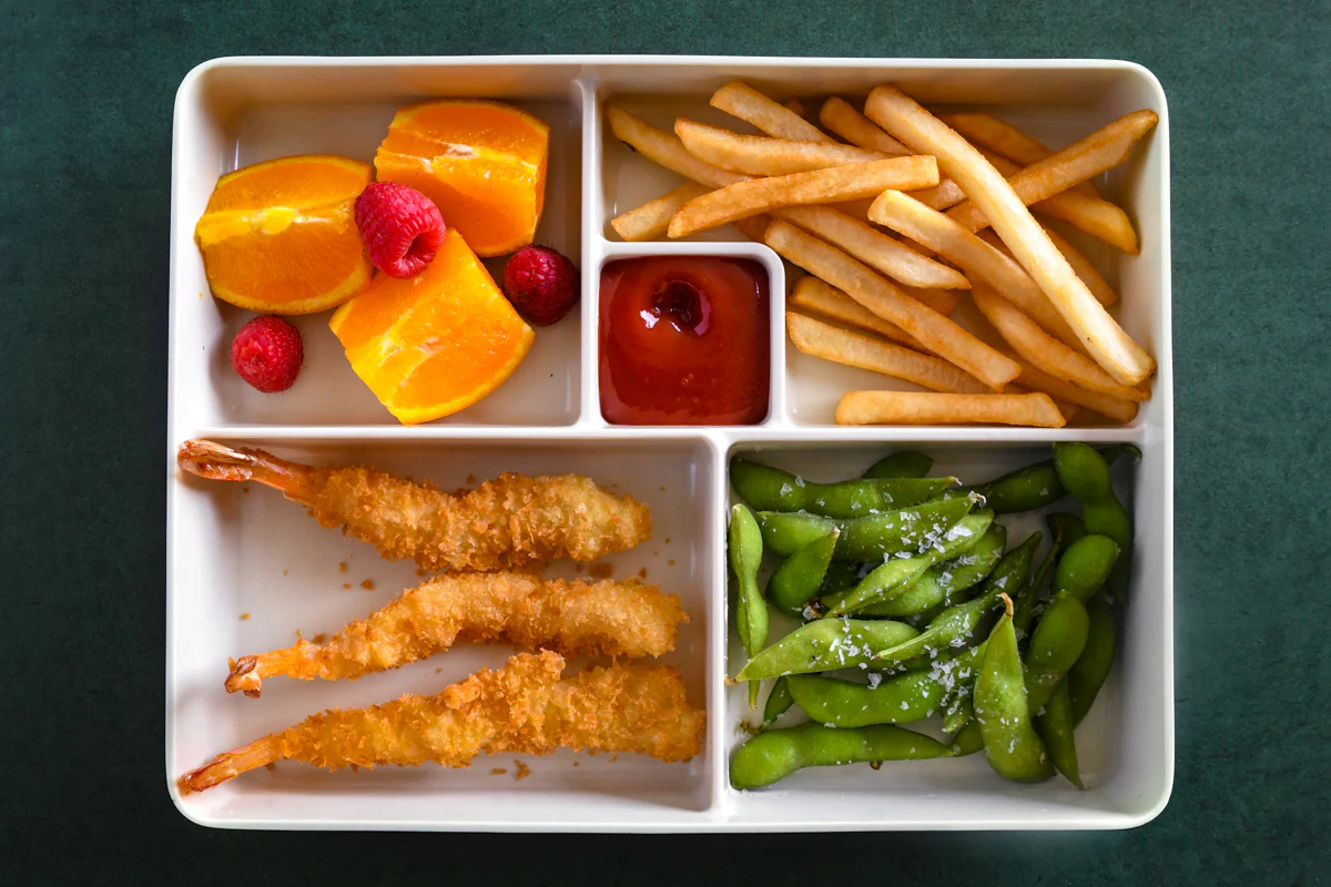 shrimp tempura (3 pcs) with edamame, choice of starch, and fruit.