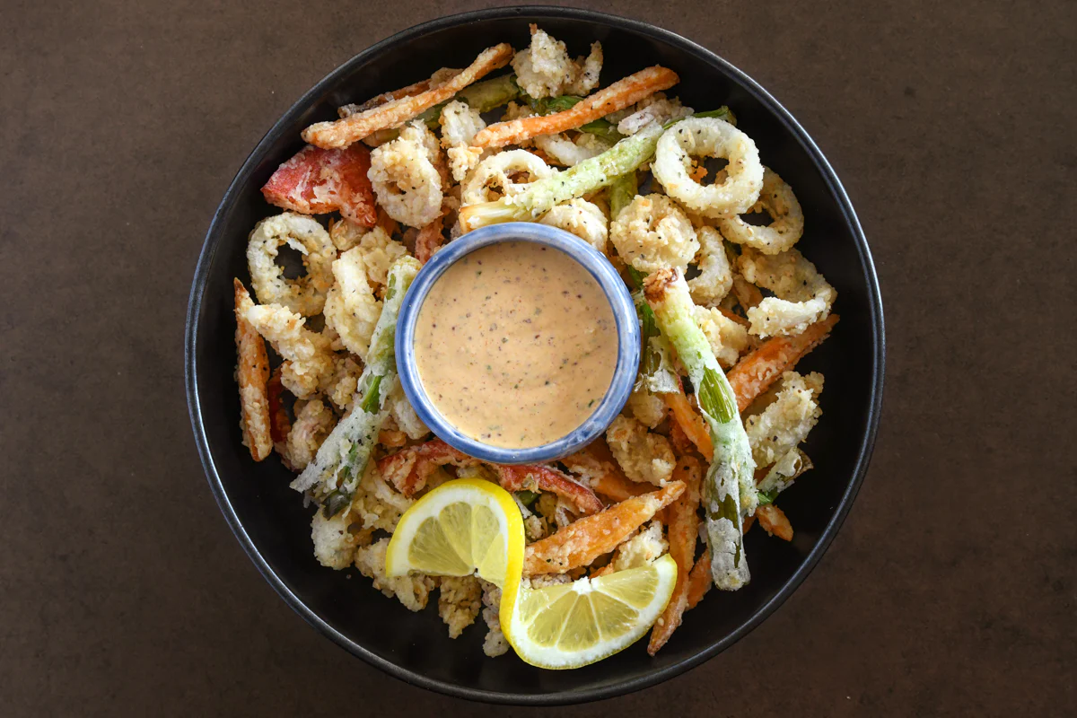 sesame crusted squid, tempura vegetable, miso aioli the seafood in this product carries an eco-certification