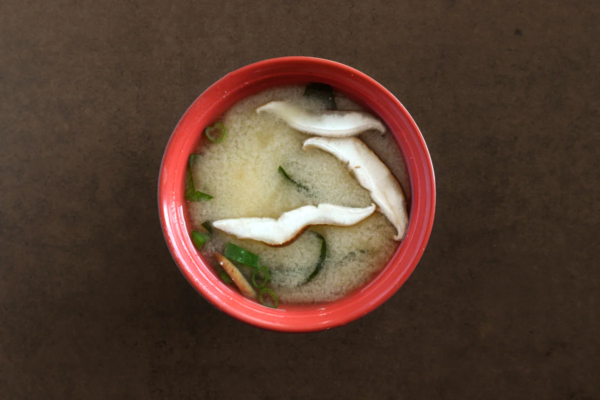 classic japanese broth style soup with shiitake mushroom, tofu, wakame and scallion