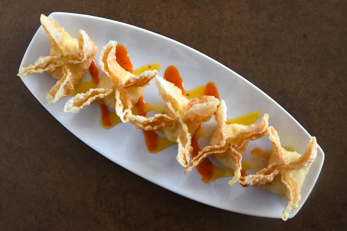 crispy wonton wrappers stuffed with crab mix, mango, cream cheese and scallion, served with mango and fresno pepper sauces the seafood in this product carries an eco-certification