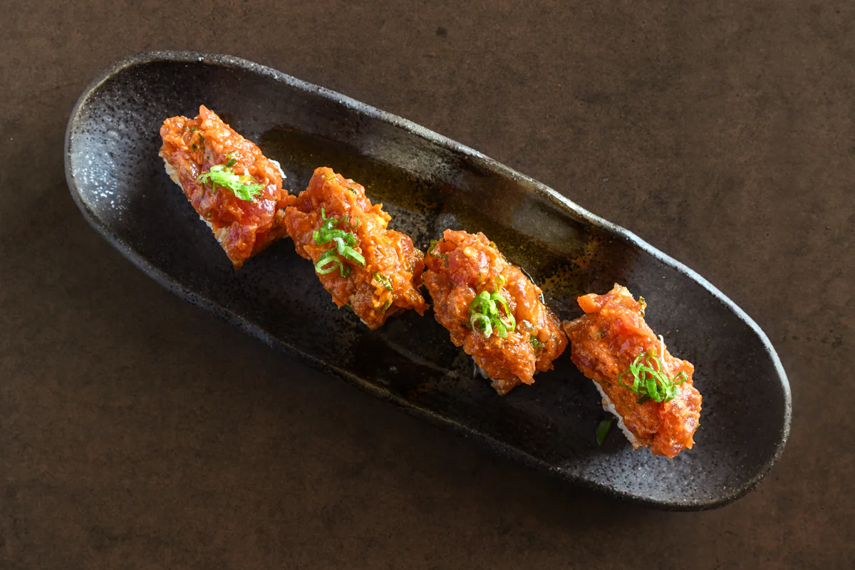 topped with spicy bigeye tuna, scallion and tataki sauce